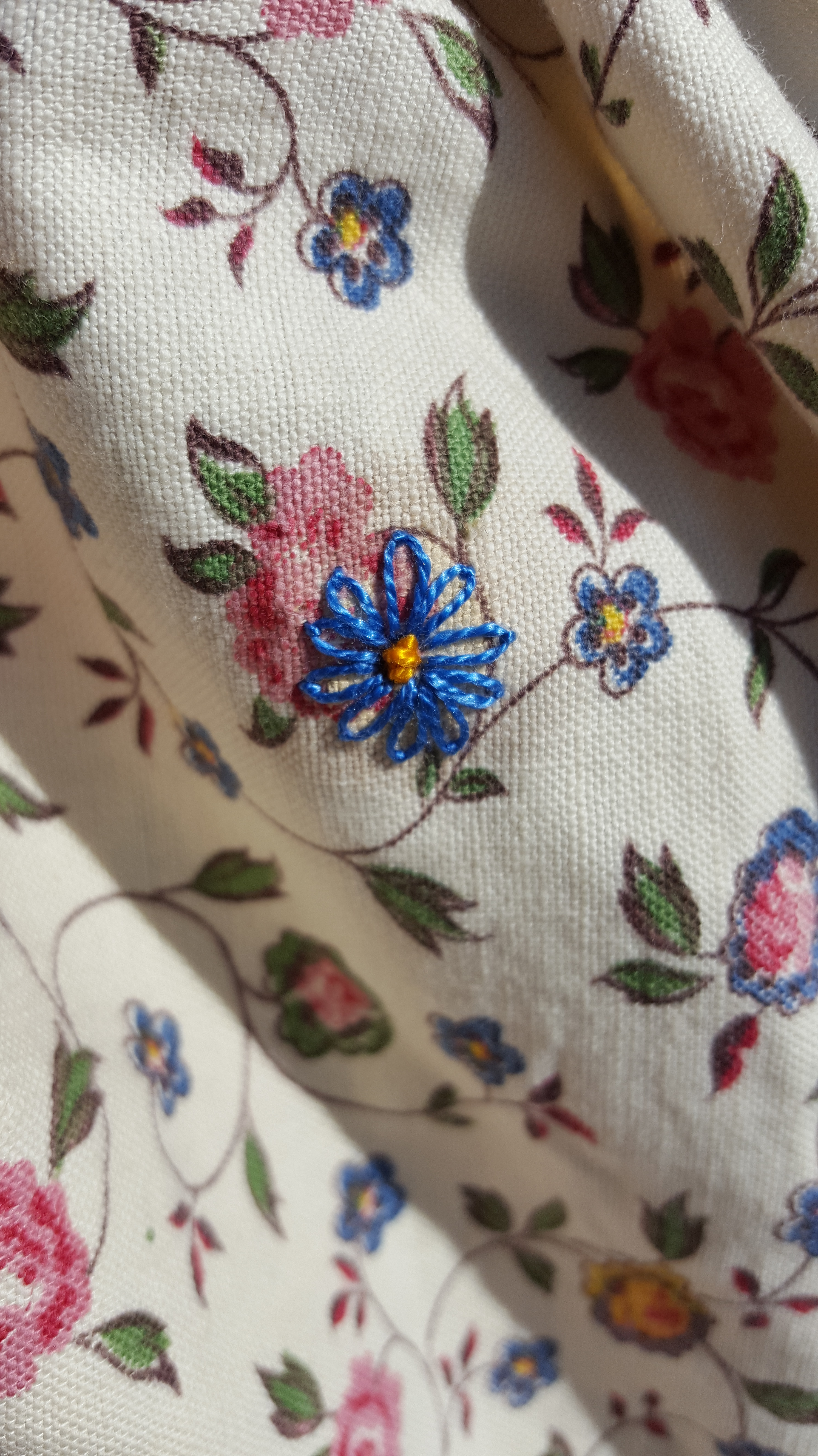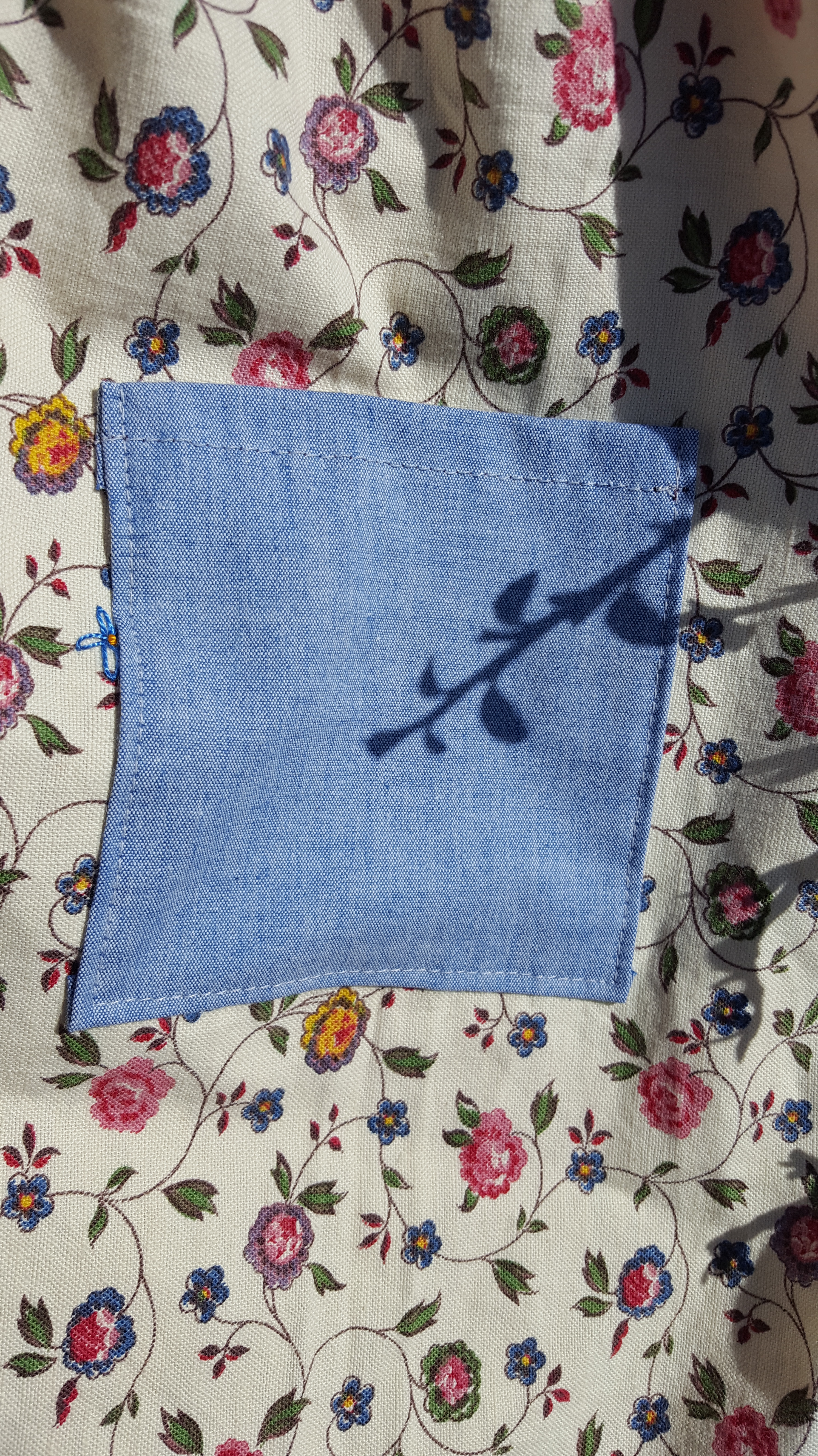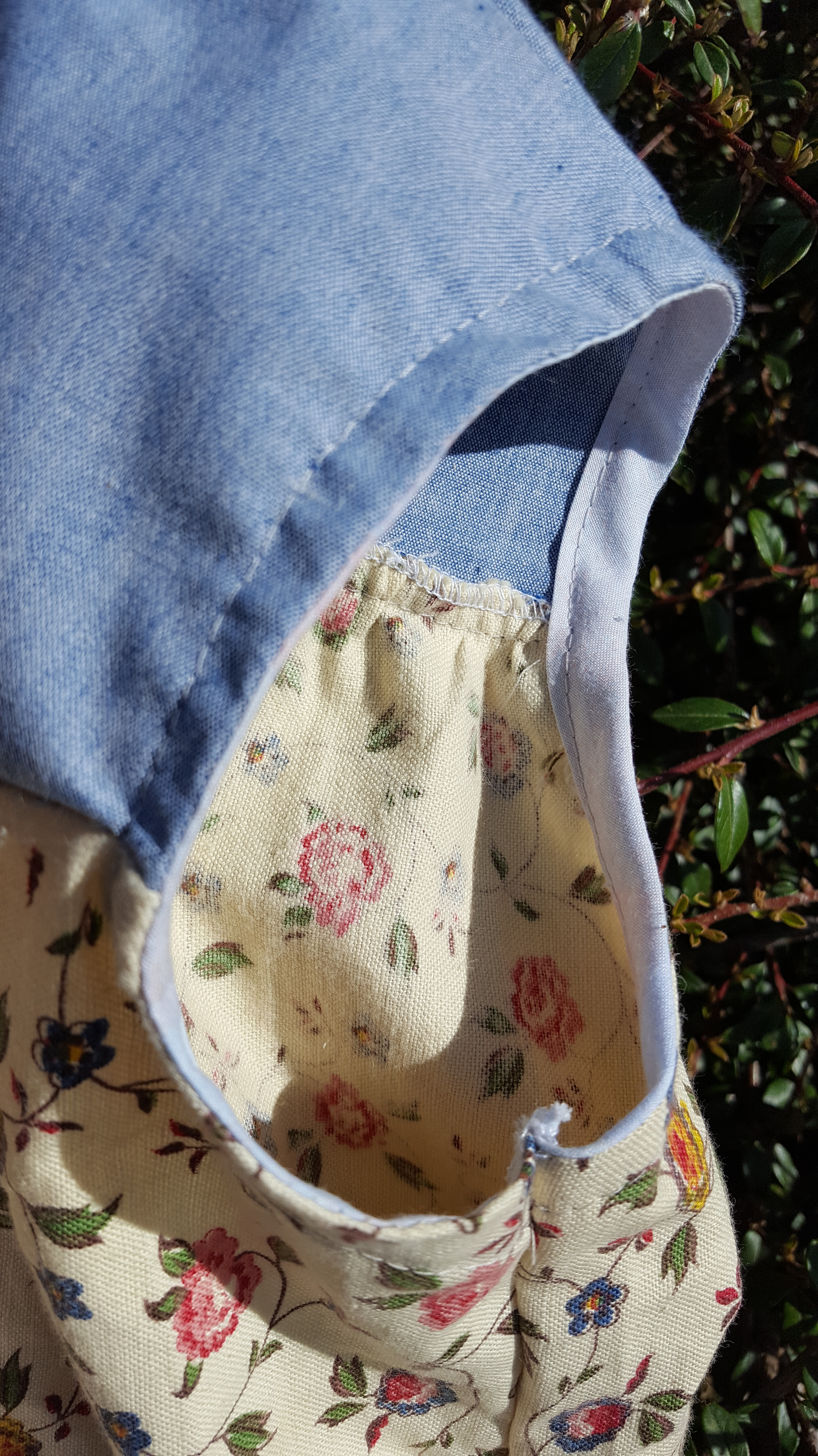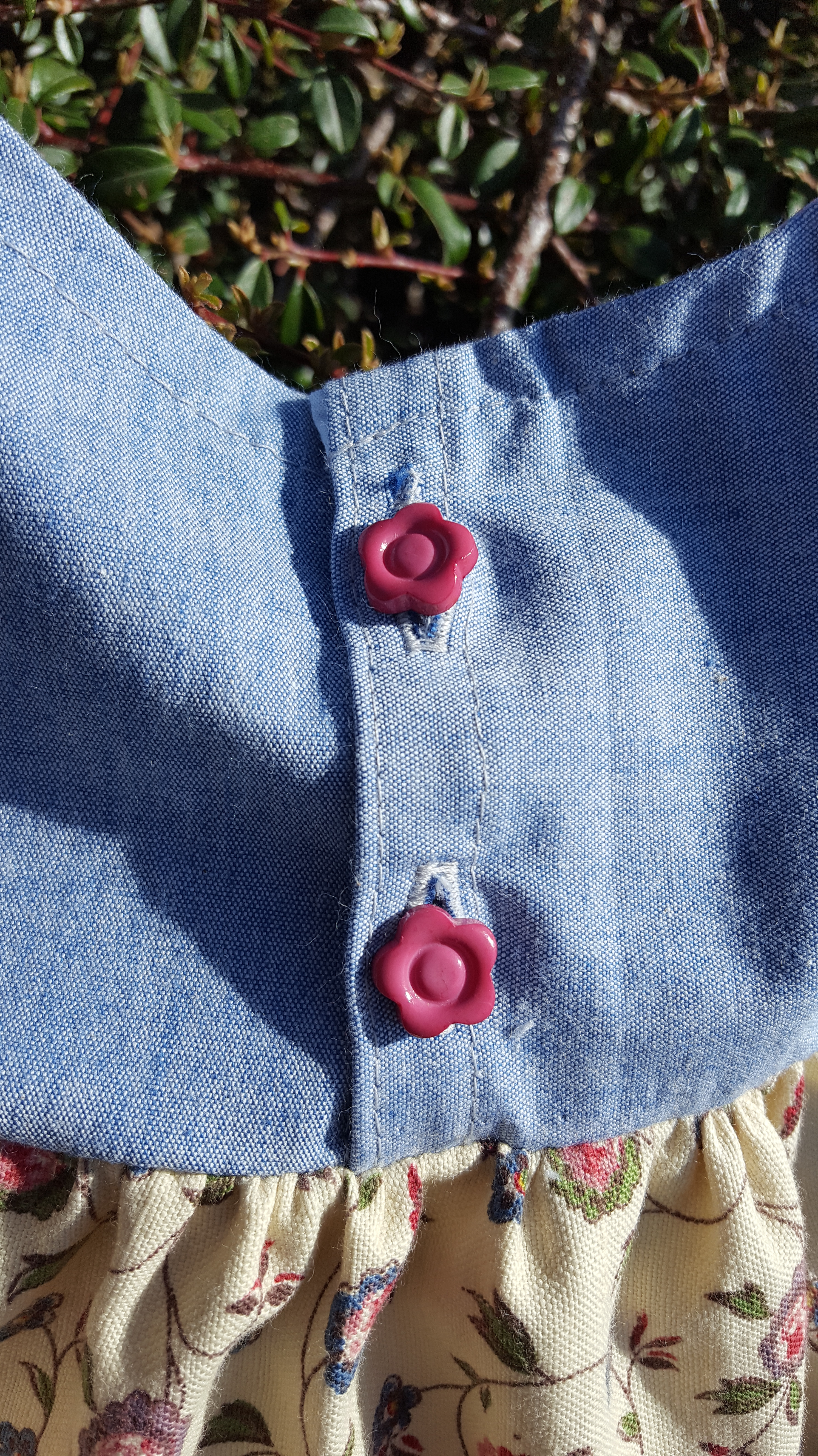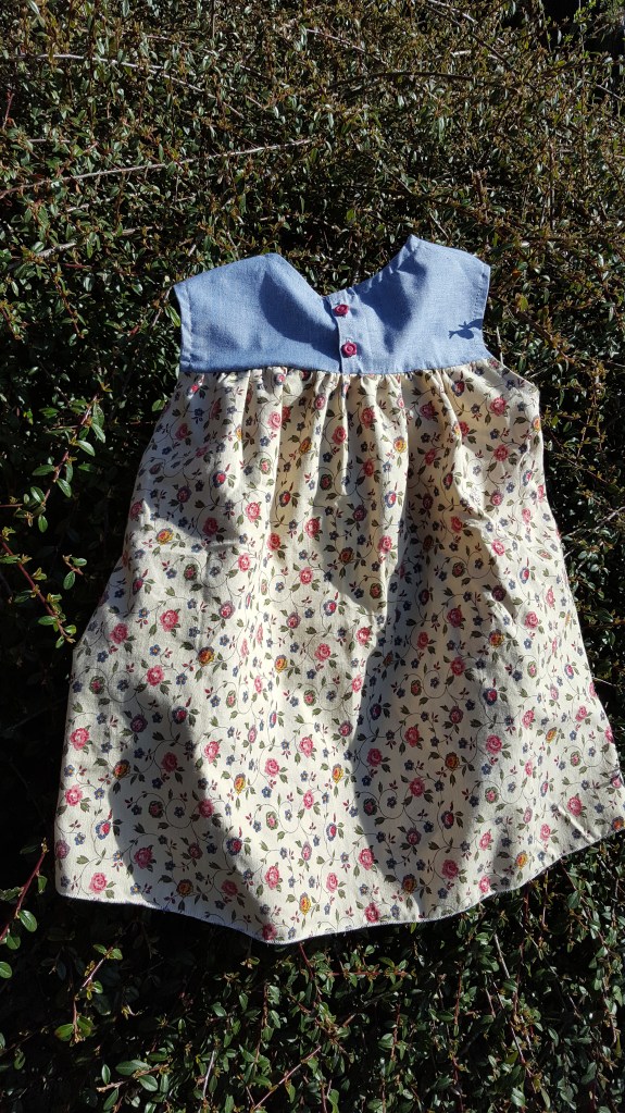 Le tissu est entièrement upcyclé car il a déjà dû être cousu, ce sont des chutes qui reviennent de feu ma tante. Le petit fleuri est adorable mais il avait des trous et des tâches (vu après l’avoir coupé sinon ce n’est pas drôle) et que j’ai camouflé avec de la broderie. Les empiècements du haut et les poches plaquées sont aussi des chutes. J’en ai juste eu assez pour faire ces parties ! Les boutons en plastique (ce n’est pas fantastique) ont été récupéré sur un ancien tricot lorsque ma première fille était bébé ; seul le biais est neuf…