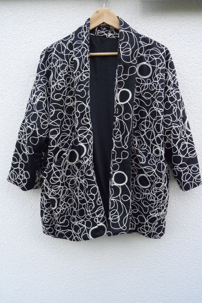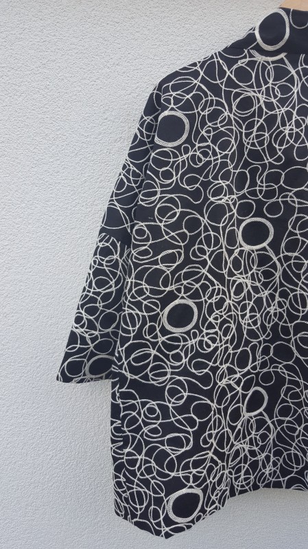 Depuis ma première veste Pekka j’avais dans la tête de m’en recoudre une seconde en noir et blanc avec ce magnifique tissu aux arabesques brodées déniché dans une ancienne brocante. Ce devait être un retour d’un fabricant destiné à la haute couture vu sa qualité et son originalité.