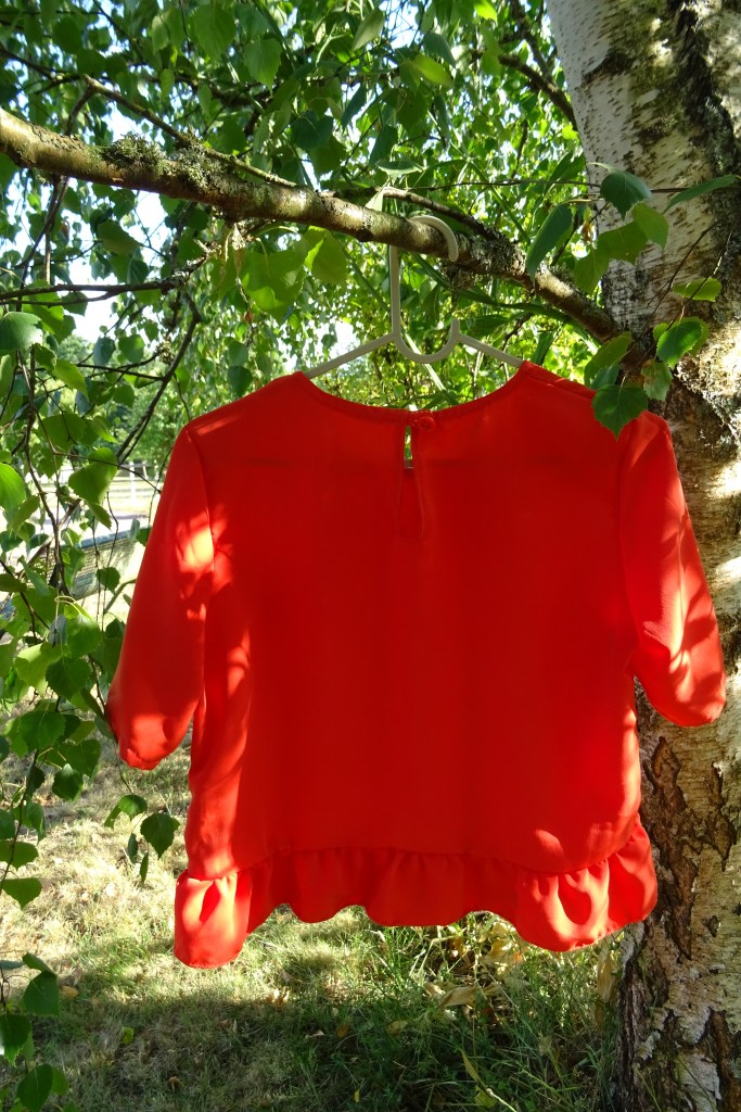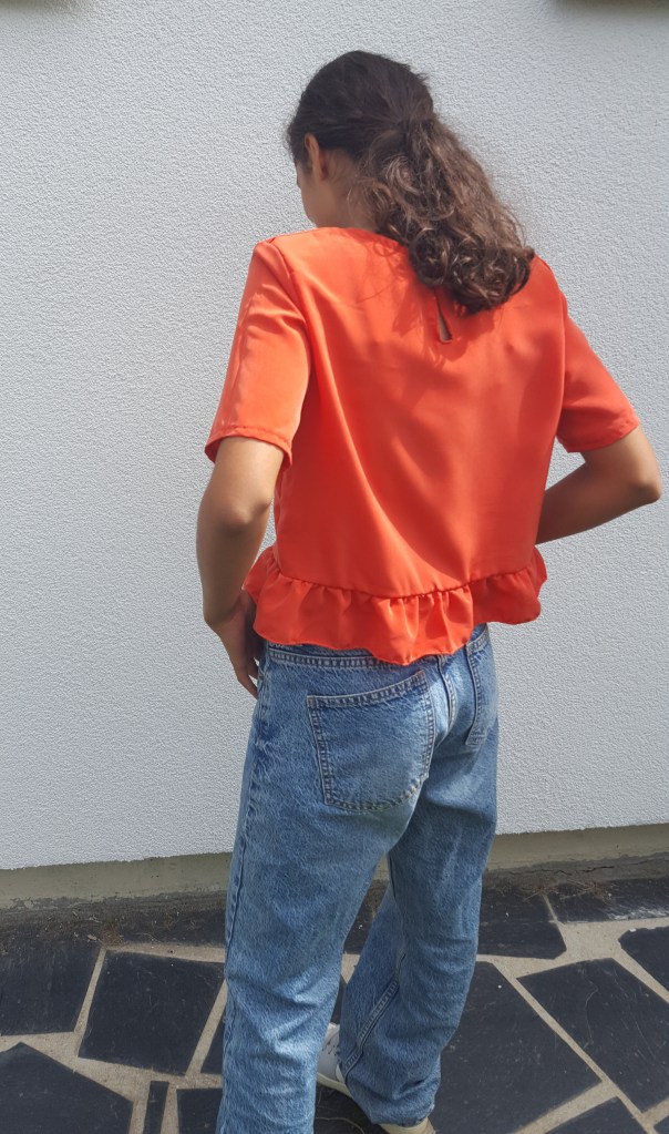 Pour la fermeture au dos en forme de goutte, j’ai vraiment eu du mal, le tissu qui est une sorte de peau de pêche glissait énormément et j’avais complètement oublié le truc pour réaliser cette ouverture. Depuis j’ai enregistré bon nombre de tutos à cet usage… En espérant pouvoir le mettre en pratique prochainement sur un tissu plus simple à travailler. J’ai ajouté un sergé orange à pointillés pour donner une petite touche funky et trouver pile poil le bouton orange assorti.