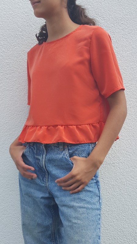 Je me suis dit que décalquer un dernier patron en taille 164 cm hollandais pourrait convenir à cette demoiselle avec deux ailes, avant de passer au XS puis au S. Ce qui est bien avec les patrons c’est que l’on peut les modifier. Le modèle est la blouse Pimpy du numéro spring 1/2020 du magazine Ottobre Kids. Nous avons retravaillé ensemble le modèle pour essayer de coller au mieux aux exigences de Mamz’elle, elle m’a fait retiré les volants des côtés (d’accord avec elle ça alourdit le modèle). La conversation sur le volant du bas a tourné court car cette décision était assujetti à la longueur hypothétique du rendu final. J’ai rallongé au maximum le buste mais en cours de montage lorsque je lui ai fait essayé et le verdict est tombé : trop court ! Pas assez de tissu ! J’ai décidé de tenter le mini volant en bas histoire de faire un peu comme le premier qu’elle porte encore et qui est devenu trop court des manches passant des manches longues aux manches 3/4 (oui je radote). Ce nouveau modèle est manches courtes comme cela le problème ne se posera plus…