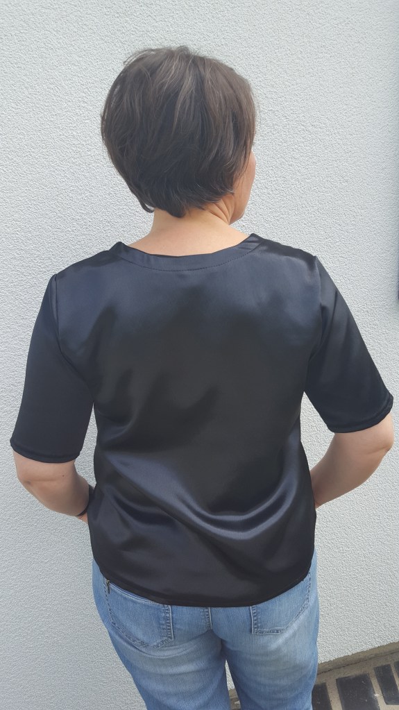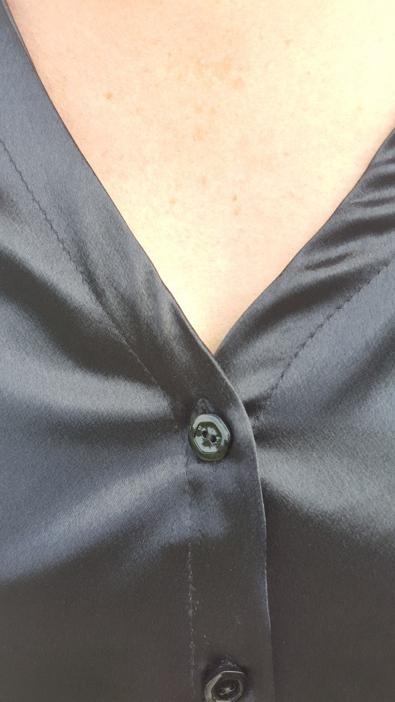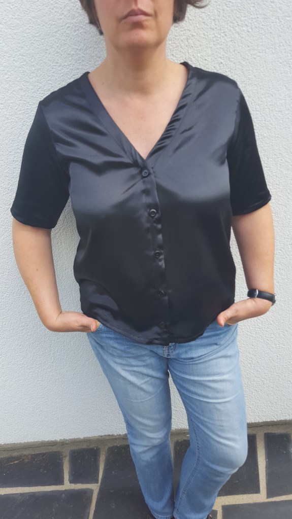 Je n’ai acheté que les boutons en mercerie. Le tissu est issu de mon stock, un tissu assez lourd, un côté mat, un côté satin. Ce tissu m’a été donné l’année dernière, merci à la personne qui m’a fait ce don, j’espère que de là où tu es, tu le vois…